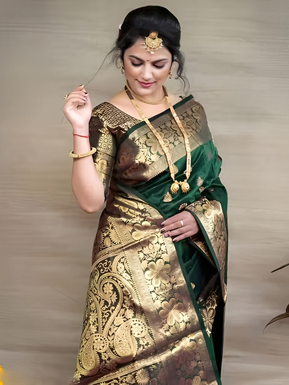- Color: Rich Green with Golden Zari Work